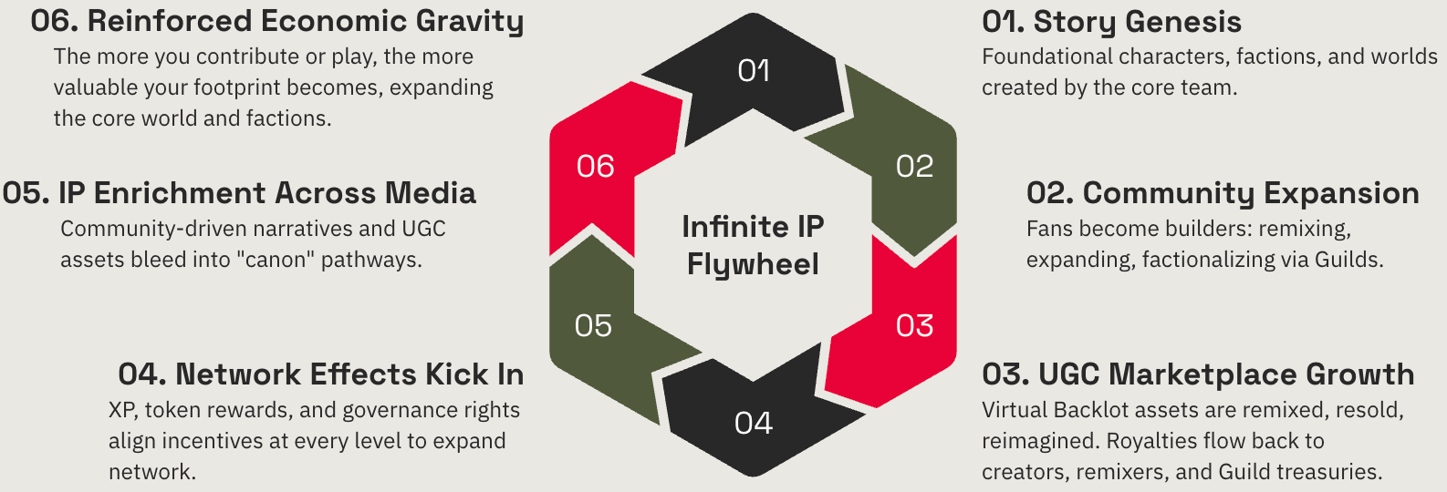 Each complete loop increases the richness, size, and value of the IP — allowing it to evolve indefinitely without needing to reboot, reset, or rely on traditional hit-driven models.