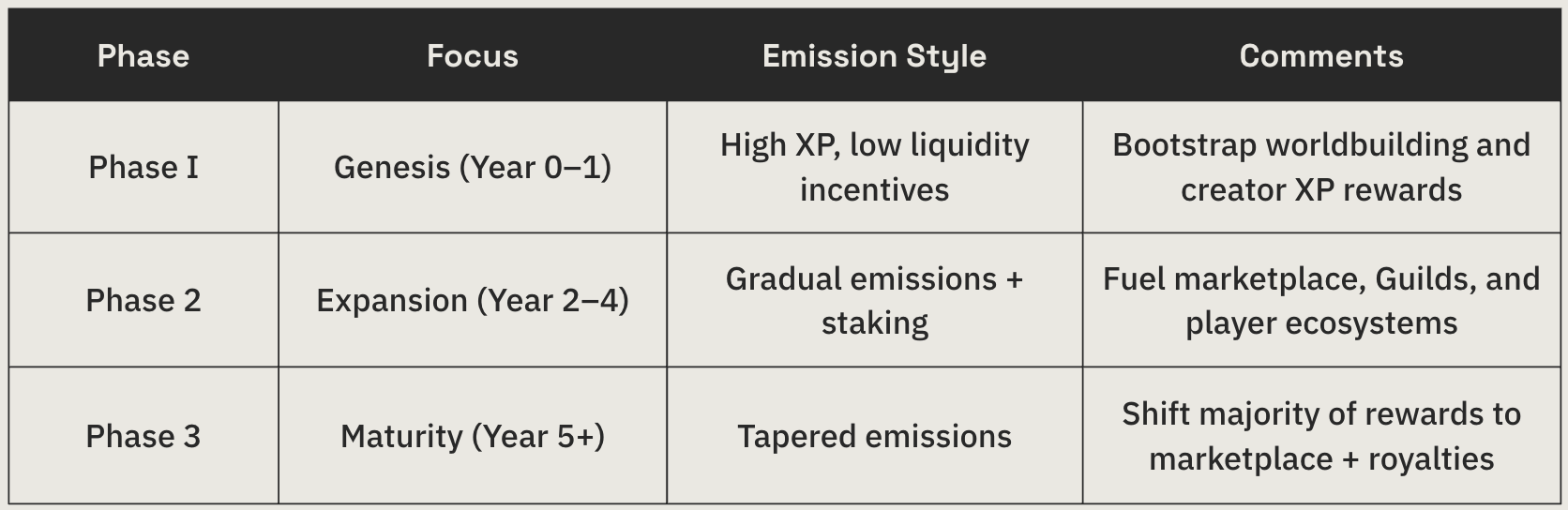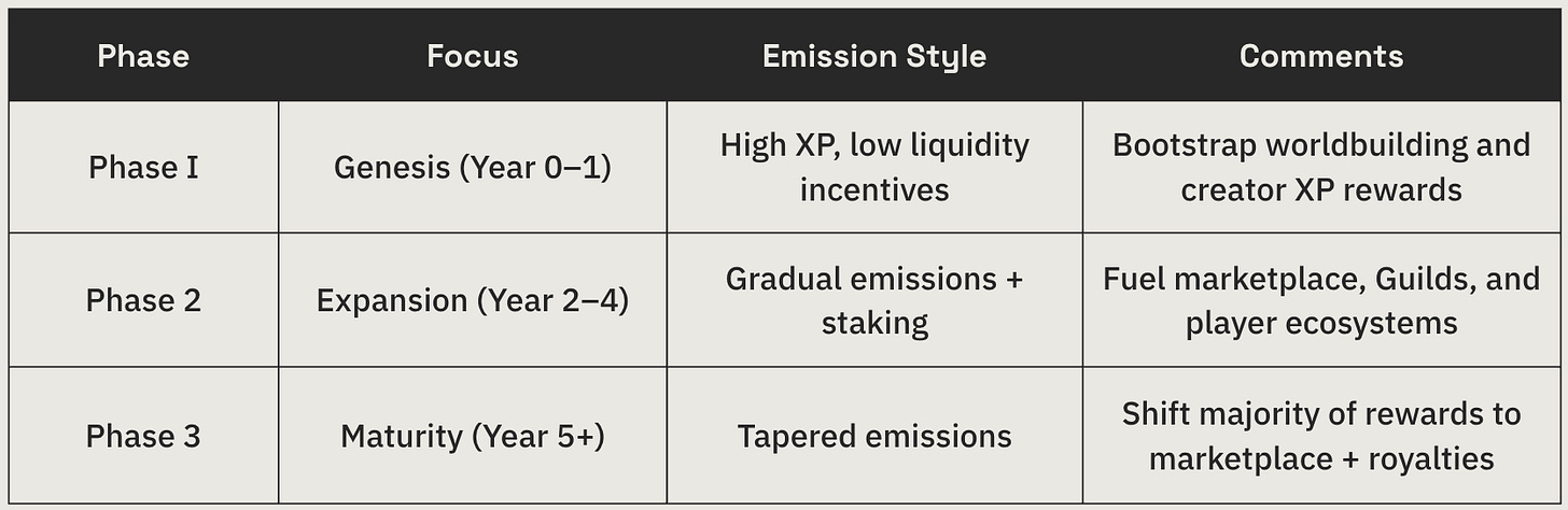 As the economy matures, emissions slow, and participants rely more on UGC royalties, gameplay earnings, and Guild activities.